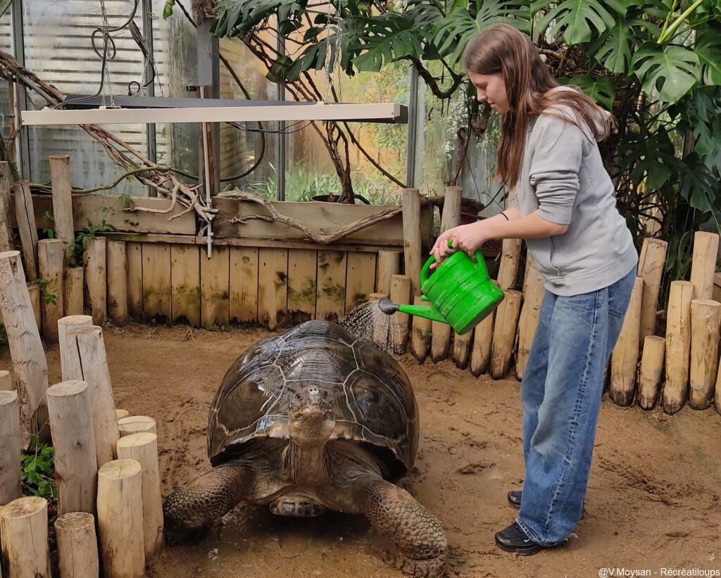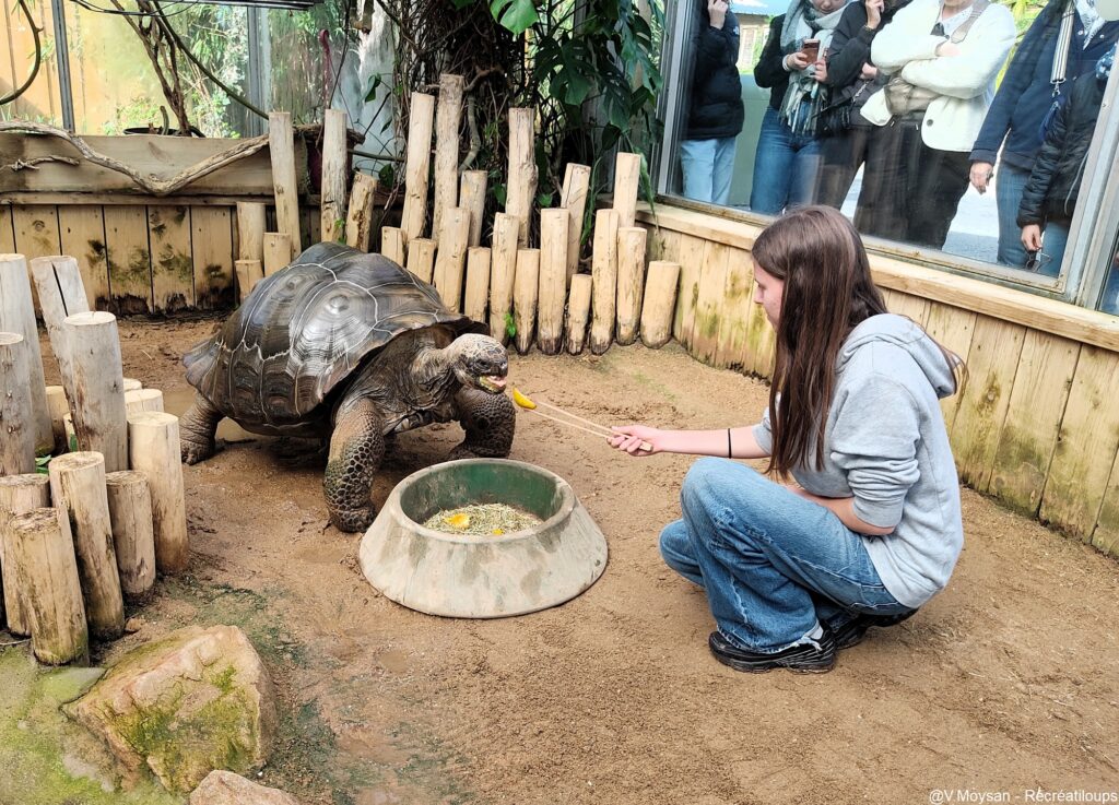 Nous partons ensuite retrouver Dodo, l’une des plus grosses tortues de la planète, dans une serre chauffée à 30°. Notre médiatrice nous présente l’espèce et son mode de vie, et nous raconte quelques petites anecdotes sur l’espèce et sur ses frères et soeurs. On apprend par exemple que Dodo s’appelait initialement Dolores, jusqu’à ce que l’équipe réalise qu’il s’agissait en fait d’un mâle ! Nous avons pu la caresser (un moment qu’elle apprécie particulièrement), lui donner sa douche, et la nourrir. Une proximité privilégiée avec la tortue que nous avons fortement appréciée !