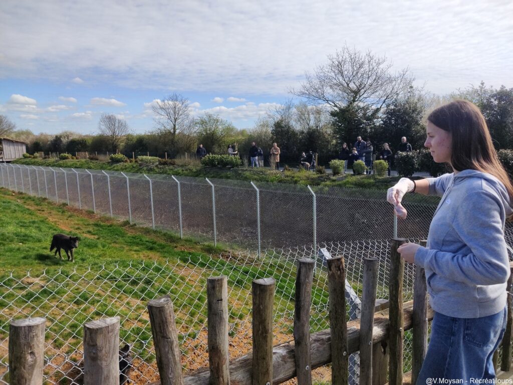 Après avoir enfilé des gants (pour protéger les animaux des microbes humains, une règle appliquée à chaque nourrissage), nous lançons la viande aux loups qui s’étaient naturellement approchés du grillage, sentant déjà notre présence. Les voir d’aussi près est une expérience rare et saisissante.
