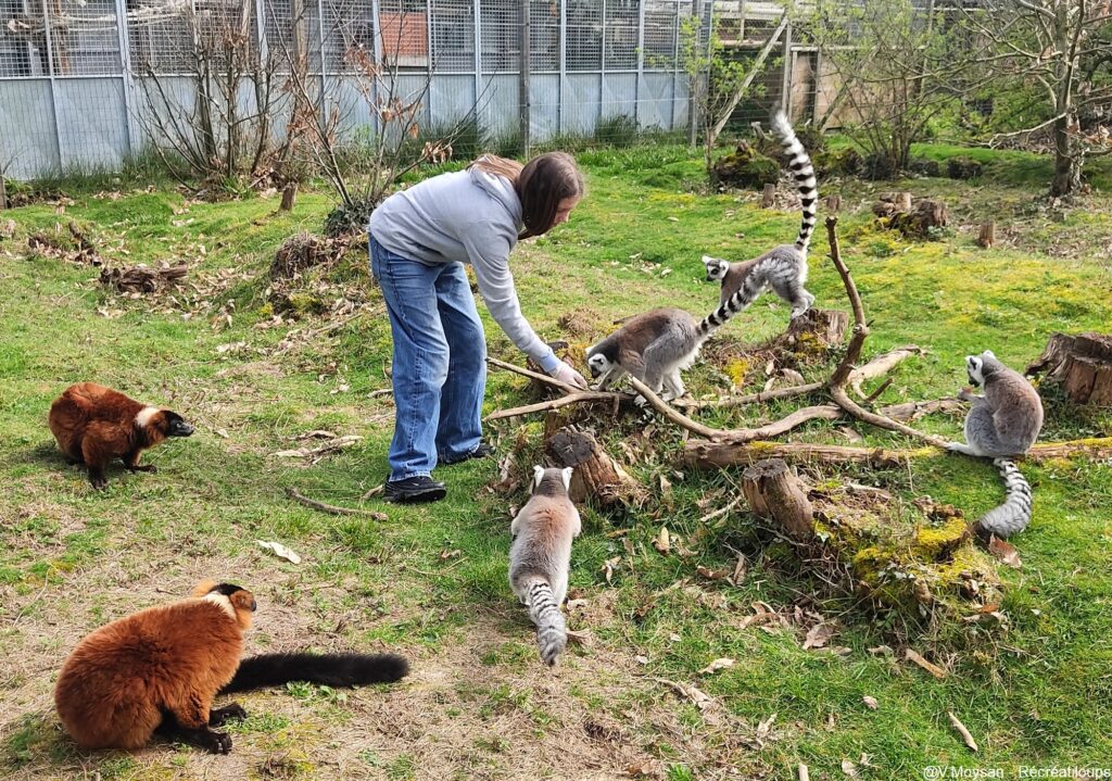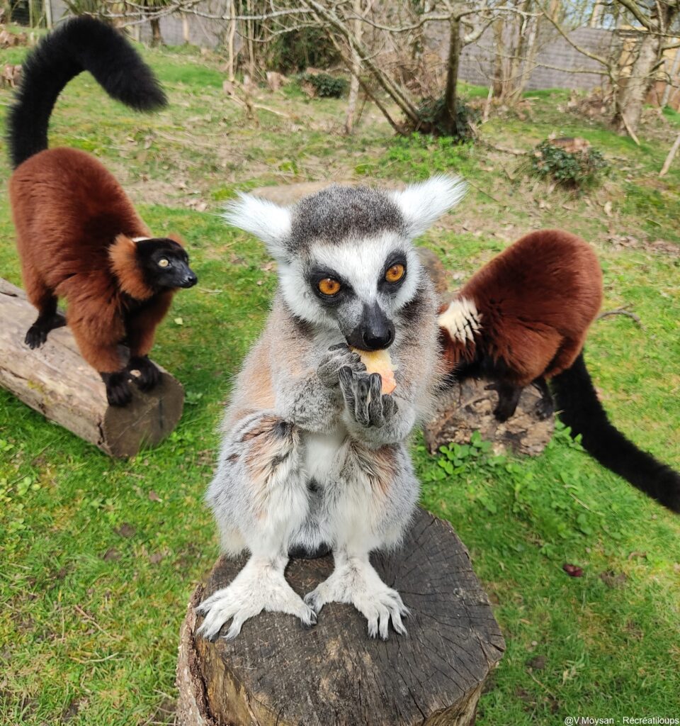 Les lémuriens évoluent dans un espace en semi-liberté avec une réelle proximité avec les humains. Une cordelette les sépare des visiteurs afin que ces derniers n’empiètent pas sur leur territoire.