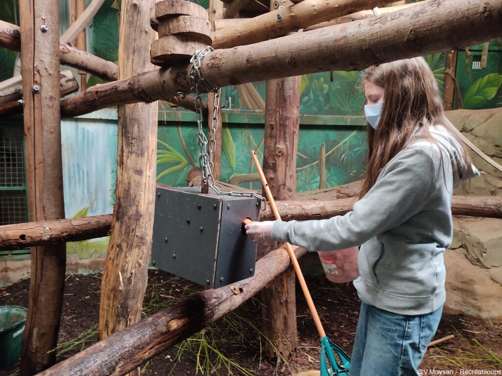 Tandis qu’une soignante s’occupe du nettoyage, nous recevons notre mission : disperser des morceaux de carottes dans tout l’espace. Certains sont bien en évidence, d’autres cachés dans des jeux d’enrichissement ou près des vitres.