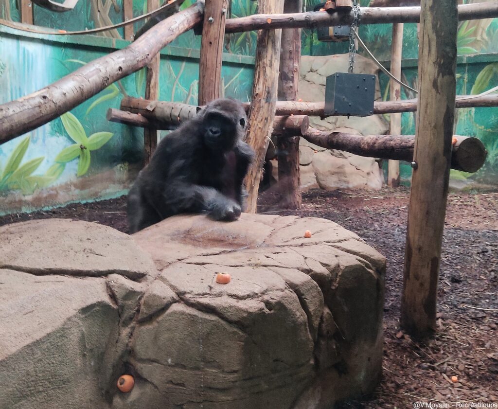 Le zoo héberge cinq gorilles comme pensionnaires : un mâle et quatre femelles. C’est une espèce fascinante, que l’on ne se lasse pas d’observer… Alors, quand notre médiatrice nous annonce que nous allons pénétrer dans leur enclos, l’émotion monte. ! Bien évidemment les gorilles sont à l’écart à ce moment-là !